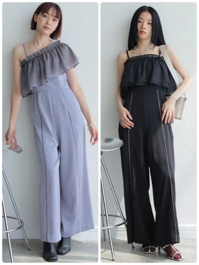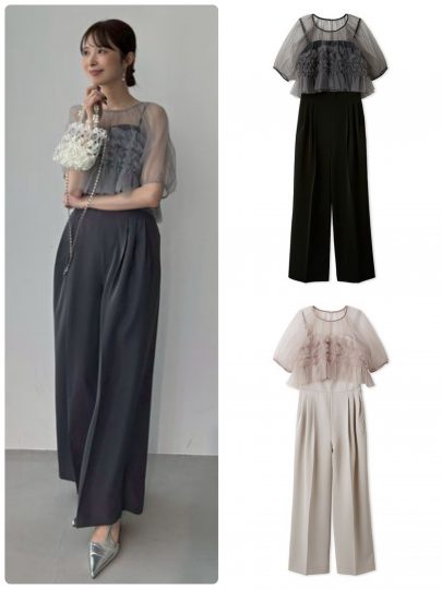 涼しく過ごせるキャミデザインのコンビネゾン。チュールブラウスを羽織ればオケージョン仕様に早変わり。透け感のあるチュールブラウスは、夏のお呼ばれシーンにぴったりです。