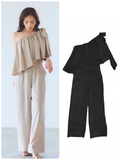 ワンショルダーのフリルとベアオールインワンをドッキングしたデザイン。大胆な肌見せスタイルで、リゾートにもオススメ。左肩のリボンがアクセントになり、写真映えが叶います。