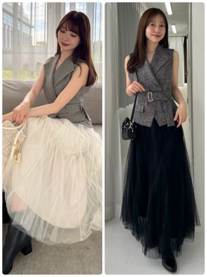ベストとチュールスカートの秋冬を先取りするシックなムードが漂うセットアップ。取り外しが可能なベルト付きのベストは、ウエストマークできてシルエットにメリハリをつけられます。チュールを贅沢に重ねたスカートは、秋冬のスタイリングに軽やかな抜け感を与えてくれます。裏地もティアードデザインにして、さらに奥行きを出しています。