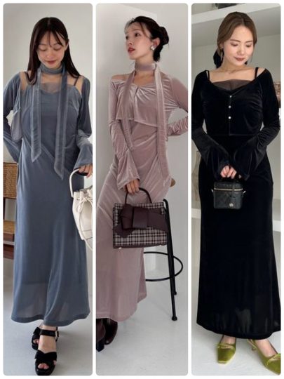 透け感がありつつストレッチ性のあるシアーベロアを使ったキャミワンピ、カーデ、タイの3点セット。ワンピースの胸元にはチュールをあしらい、素材感の差が新鮮なアクセントになっています。セットになったタイチョーカーは、手持ちの服にもアクセ代わりに使えば、一気に今年顔に。ヘアに使うのもおすすめ。カーディガンは程よい襟あきで、さりげない肌見せが可能なデザイン。ワンピースの肩見せとのバランスもよい、計算された形です。
