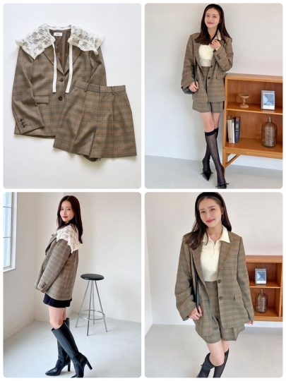 レース襟をドッキングした2WAYテーラードジャケットと、美シルエットのタックショーパンは、適度なハリ感と柔らかさのあるスーツ生地を使用。ケープ風のホワイトのレース襟は、ボタンで取り外し可能です。ショートパンツは深めのワンタックとすっきりとしたセンタープレスを入れ、気になる腰回りをサポート。やや長めの膝上丈で、チュニック丈のアイテムの下に履いても美バランスに。