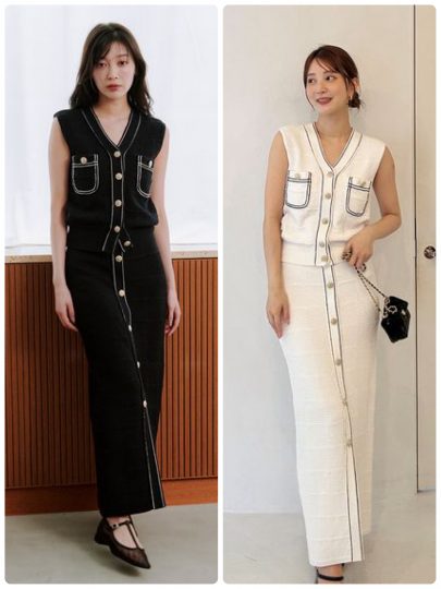 鹿子編みとタック編みを組み合わせて、格子柄に編み立てた表情豊かなジレとスカート。立体的な編み地で肌に触れる面積が少ないニット生地は、まだ暑い季節からも着やすいアイテムです。ポケットや前立てに利かせた配色ステッチと、リュクスな印象の格子柄のゴールドメタルボタンがポイントに。少し肩にかかる程よくオーバーなサイズ感で、抜け感を出しつつ、二の腕をカバー。同素材のタイトニットスカートとセットアップできちんと見えスタイルに。